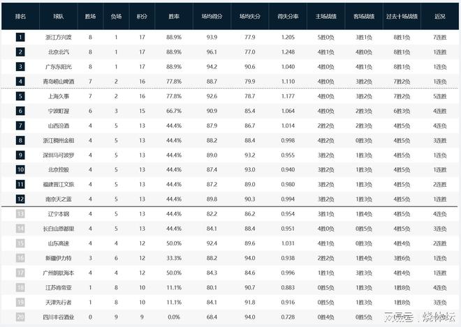 此外,近期辽宁、新疆等球队的表现都比较低迷,目前排名相对来说都不高。宁波、浙江等呈现出不错的上升势头,排名节节攀升。此外,四川男篮仍未拿到赛季首胜。