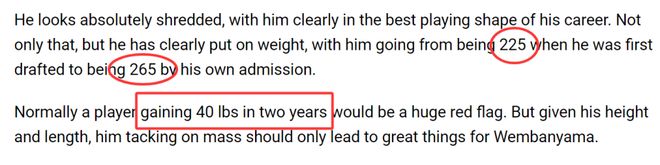 通常情况下,一名球员在两年内增重40磅(约18公斤)会是一个不小的隐患,可能增加伤病风险或影响灵活性。但考虑到文班亚马的身高与臂展(2米24身高+2米44臂展),这次增重对他而言大概率只会带来积极影响。