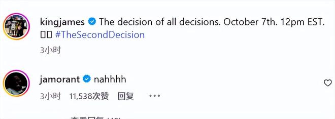 现年40岁的詹姆斯会宣布怎样的决定?不少人推测和退役有关。灰熊球星莫兰特连续在评论区里回应,他先是发了一条“不!”这或许也代表了很多球迷的心声,不愿意看到詹姆斯宣布退役的一刻。不过随后,莫兰特又评论道:“他们说你在骗人。”这也代表了一些人的猜测,认为这次决定未必就是宣布退役,可能是营销。