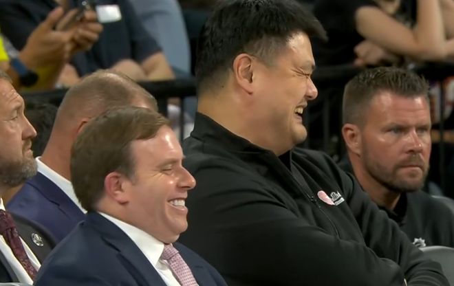 本场比赛,姚明在场边贡献了经典的大笑表情包,值得一提的是,坐在姚明场边跟他相谈甚欢的人,是独行侠的老板帕特里克·杜蒙特。