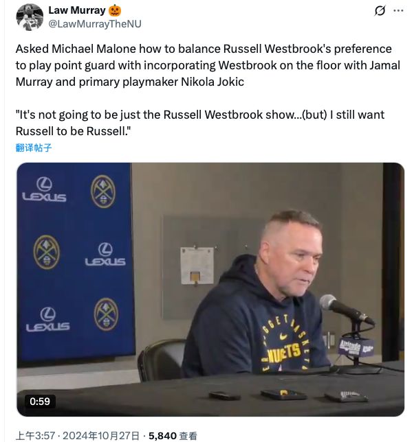2024年休赛期,威少加盟掘金,赛季初的一次新闻发布会上,球队主帅马龙谈到威少与约基奇、穆雷如何共存时表示:“这不会变成威少的个人秀……我依然希望威少做自己。”
