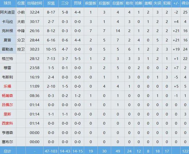 开拓者三人得分20+,阿夫迪亚25分4板4助,霍勒迪24分5板6助,格兰特22分3板3助3断,克林根16分14板(7前场板)两双到手