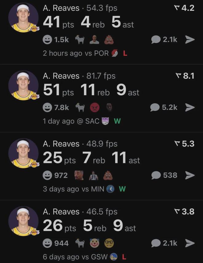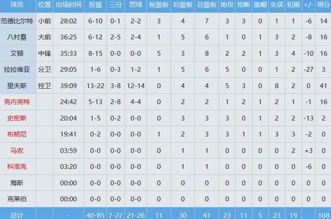 湖人那边,艾顿面对旧主16分8板(5前场板)2助2断,里夫斯41分4板5助3断。