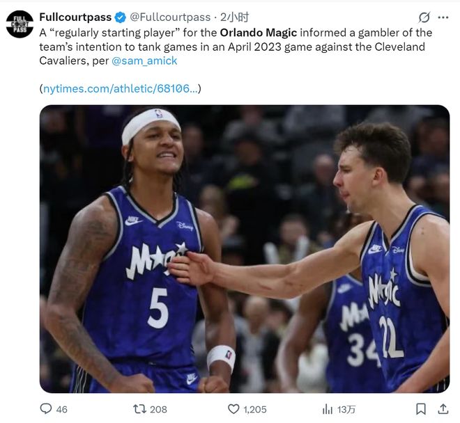 魔术队同样卷入这场风暴。报道披露2023年4月7日魔术对阵骑士前,一位已离队的“常规首发球员”向赌徒透露球队将摆烂的计划。那场94-118的惨败如今看来疑点重重,虽然未公布具体姓名,但当时魔术的首发阵容中,富尔茨和加里-哈里斯如今都已离队。