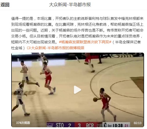 如今开拓者已经宣布将杨瀚森召回球队,针对杨瀚森近期来回奔波征战的情况,青岛男篮队记杜金城给出解析:“近期关于杨瀚森的场外传言不断,有传言称开拓者可能会交易小杨(杨瀚森)。但从目前情况看,开拓者绝对是把杨瀚森作为未来的重点球员培养,短期内不太可能出现被交易。”