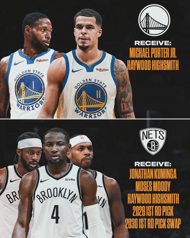 露天看台(BR)模拟一笔交易方案:勇士送出库明加、穆迪、希尔德、2028年首轮签、2030年首轮互换权,5换2得到小波特和海史密斯。现在的问题是,篮网对库明加不感兴趣,所以勇士需要拉来第三支甚至第四支球队参与交易。