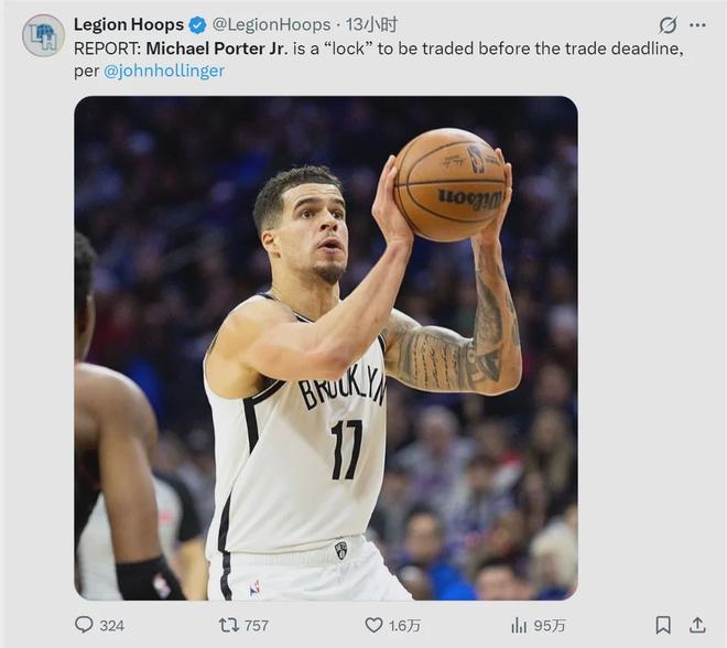 - NBA名记John Hollinger报道,小迈克尔-波特在交易截止(2.6)日前被篮网送走是板上钉钉的事,篮网想要趁着小波特打...发表于: 01-12 15:03