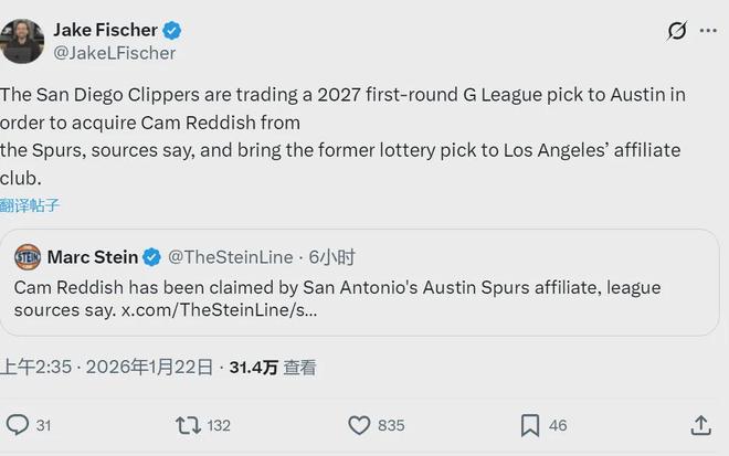 北京时间1月22日,两则发展联盟的签约消息,都是大家很熟悉的球员:1、马刺下属球队奥斯汀马刺签下卡姆-雷迪什,并将其交易至快船下属的圣地亚哥快船队,换来一个发展联盟首轮签;2、