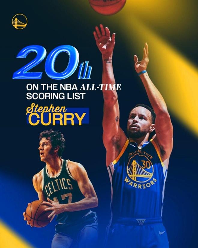 凭借这样的表现,库里生涯总得分来到26397分,成功超越历史第20名的哈弗里切克,与皮尔斯并列历史第19名,下一步将追逐18名的邓肯(26496分)。