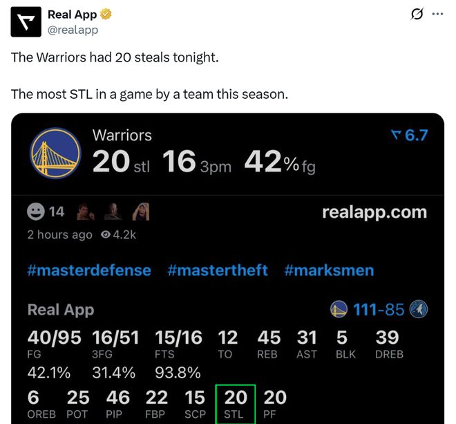 全场勇士队一共送出多达20次抢断,创造本赛季单场新高,其中首发库里与波杰均送出4次抢断,理查兹3次、追梦与桑托斯2次、霍福德、梅尔顿、波斯特、TJD、斯宾塞均有1次入账。