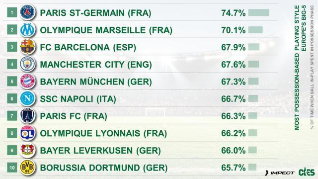 体坛周报全媒体报道“足球天文台”(CIES)公布欧洲五大联赛球队“阵地进攻”和“转换进攻”榜单。排名显示,法甲的巴黎和马赛最热衷于通过掌控球权发起进攻,占比超过了70%,排名三