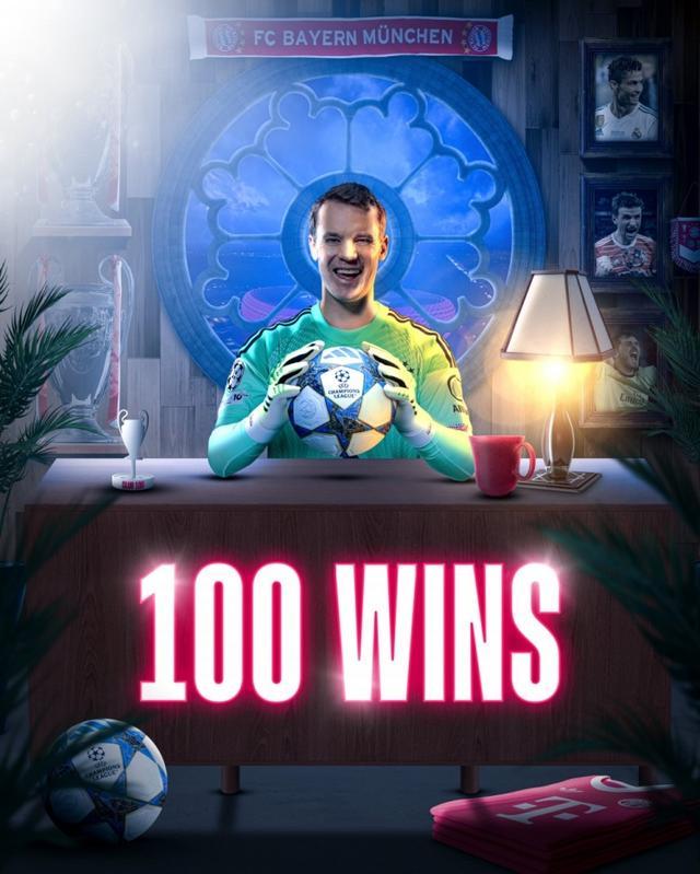 根据拜仁官方的数据统计,诺伊尔成为欧冠历史上第四位收获100场胜利的球员,在他之前的是C罗、托马斯-穆勒和卡西利亚斯。