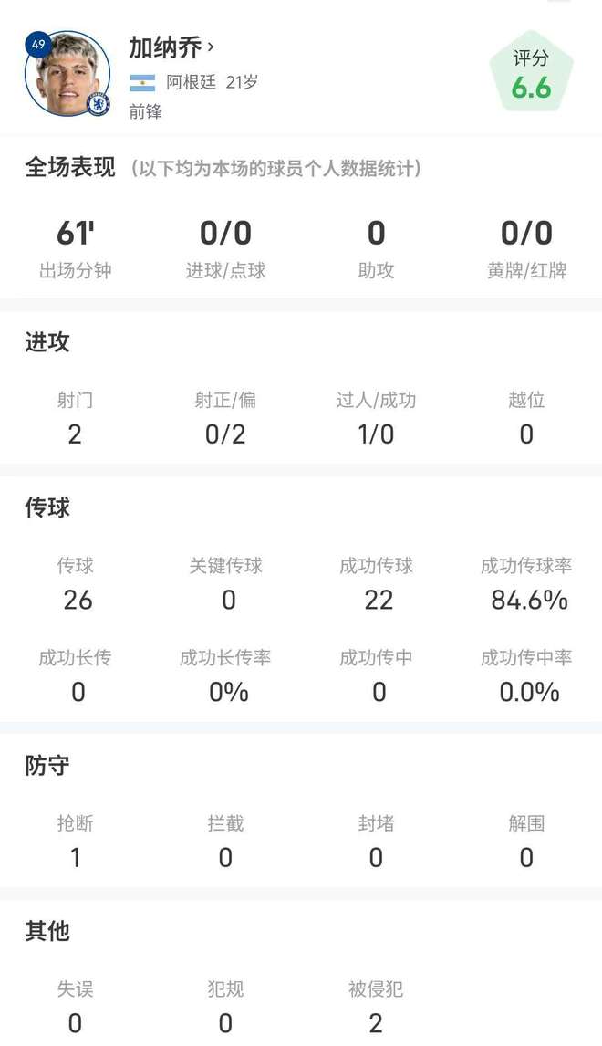 雷速体育10月1日讯 欧冠联赛阶段第2轮,切尔西暂时1-0领先本菲卡,加纳乔首发出战造乌龙,在第61分钟被吉滕斯换下。加纳乔全场具体数据:出场时间61分钟2次射门,0次射正1次过人,0次