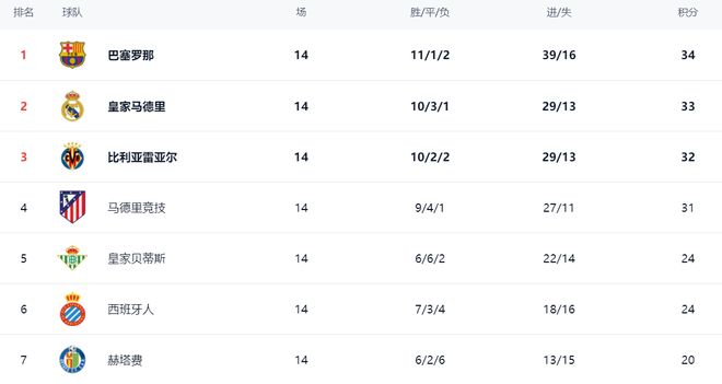 在积分榜上,巴萨依然占据榜首位置。巴萨11胜1平2负,拿到34个积分。而皇马因为这段时间频频丢分,无缘榜首位置,10胜3平1负的战绩,只拿到33分,屈居第2。第3的是比利亚雷亚尔,拿到了32分,排名第3。马竞9胜4平1负,拿到31分,排名第4。冠军的争夺非常激烈,前4最多只差3分,榜首随时都有可能易主。