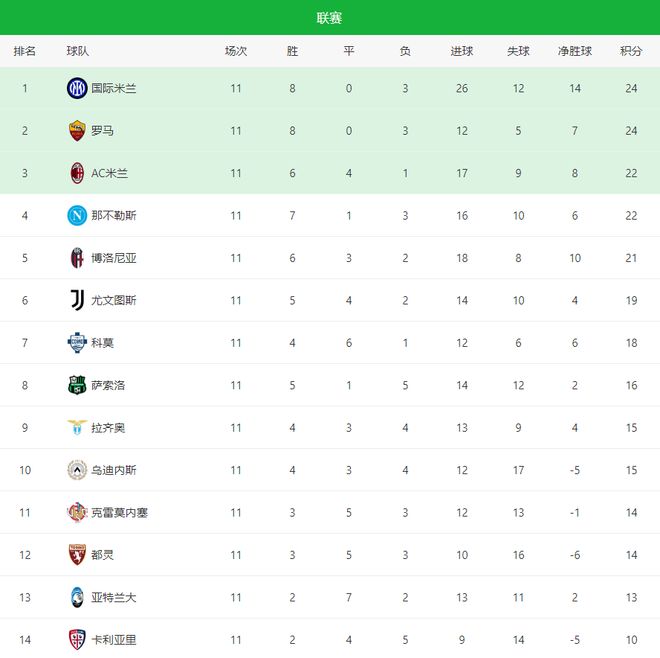 本赛季的意甲联赛争冠争四异常的激烈,没有一枝独秀的球队,前5球都分差咬得非常的紧,一场比赛的结束,就瞬间让积分榜大变样,确实是近年来少有的刺激。联赛第11轮多场比赛在今天同时结束,竞争格局彻底乱了套:卫冕冠军那不勒斯客场爆冷不敌博洛尼亚;罗马坐镇主场稳稳拿下乌迪内斯再度反超AC米兰;而国际米兰则在强强对话中轻松击败拉齐奥,最终凭借净胜球优势成功跃居榜首位置。