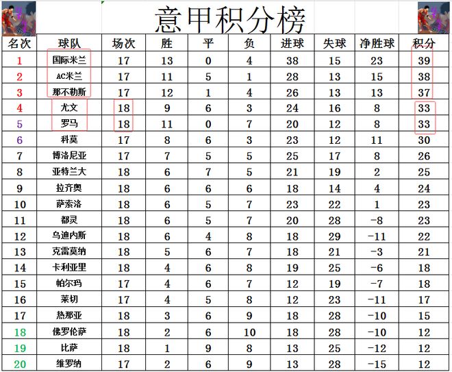 积分榜方面,国米主场轻取博洛尼亚后,又是以1分优势超过AC米兰,夺回榜首。那不勒斯也不甘示弱,完胜拉齐奥后,也还是1分之差紧追AC米兰,领先第4的尤文,第5的罗马4分,坐稳第3的位置。