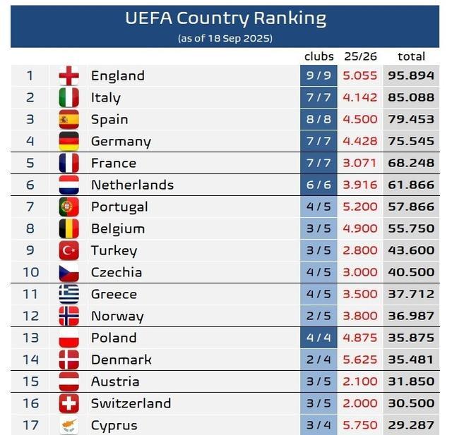 9月19日讯 欧冠联赛阶段首轮已经完赛,相关机构也统计了本赛季的欧战积分情况,并更新了欧足联旗下各协会的积分排名。英格兰依然独自领跑,而意大利第二的位置仍暂时牢固,但领先优