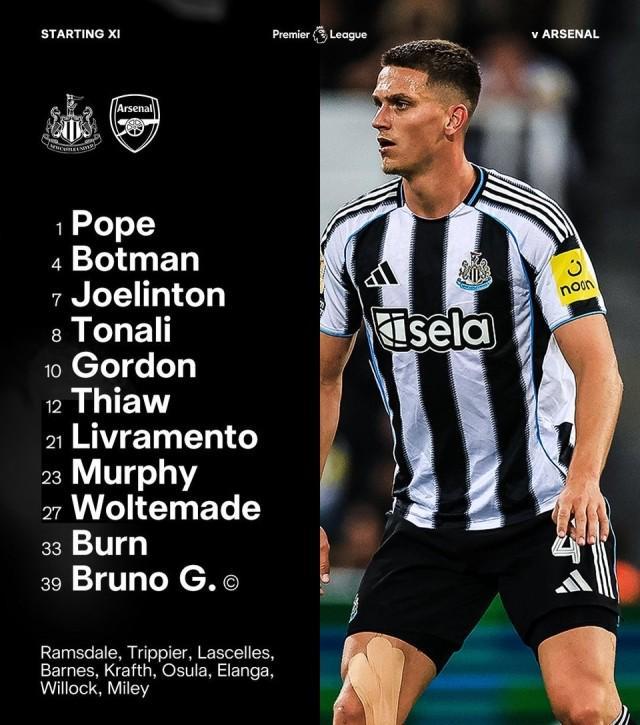 英超第6轮压轴大战,阿森纳作客纽卡斯尔联,赛前双方公布首发。 纽卡首发:波普、博特曼、若埃林通、托纳利、戈登、佳夫、利夫拉门托、墨菲、沃尔特马德、丹·伯恩、吉马良斯(队长) 替补:拉姆斯代尔、特里皮尔、拉塞尔斯、巴恩斯、克拉夫特、奥苏拉、埃兰加、威洛克、迈利 阿森纳首发:拉亚、廷伯、莫斯克拉、加布里埃尔、卡拉菲奥里、苏维门迪、赖斯、埃泽、萨卡、特罗萨尔、哲凯赖什 替补:凯帕、萨利巴、刘易斯-斯凯利、本·怀特、厄德高、内尔高、梅里诺、马丁内利、道曼