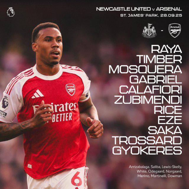 纽卡vs阿森纳双方公布首发
