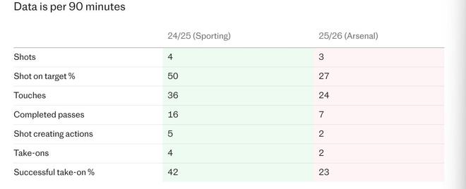在最基本的层面上,哲凯赖什在阿森纳的触球机会比在葡萄牙体育时少。在所有比赛中,他每90分钟的触球次数从上赛季的36次下降到本赛季至今的24次。