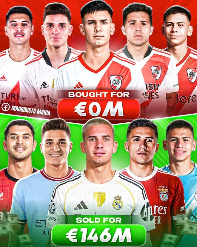 北京时间10月11日,来自Madridista Mania的统计指出,河床近几个赛季通过青训培养的胡利安-阿尔瓦雷斯、恩佐-费尔南德斯以及马斯坦托诺等球员一共为他们带来了1.46亿欧元的转会