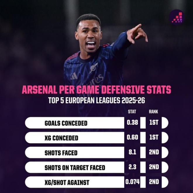 数据统计显示,阿森纳本赛季5项防守端关键数据均位列英超前二: