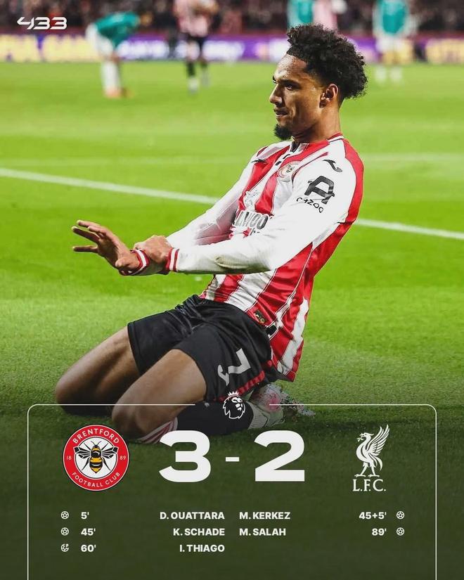 英超9轮,布伦特福德主场迎战利物浦。此役,主场作战的布伦特福德开场仅5分钟就取得进球,瓦塔拉倒钩破门。第45分钟,沙德单刀扩大比分。上半场伤停补时阶段,凯尔凯兹帮助利物浦扳回一球。