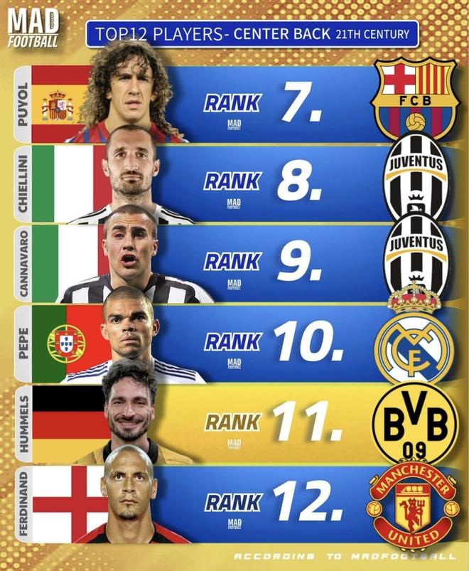 普约尔仅第7明显偏低。他在巴萨与西班牙的双核心地位、长期稳定性与大赛质量(欧冠+世界杯+欧洲杯)兼具,应进入前四的讨论。费迪南德排到第12也偏低;英超统治期的后防组织、出球与阅读比赛能力,使他至少应处于5–8名这一档。