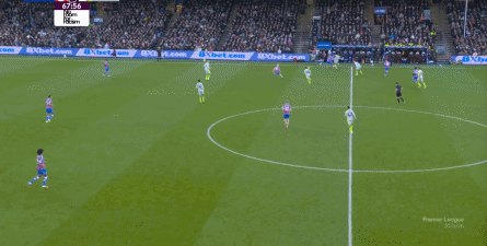 这使得水晶宫错过了他们的最好的战机窗口,因为体能问题即将找上门来,于是在此之后,水晶宫再无快速反击和进攻的机会,反倒是曼城,通过贝尔纳多-席尔瓦的牵制,暴露出了右侧禁区角的空间,找到了中场出身的努内斯,为后点的哈兰德送上了传中: