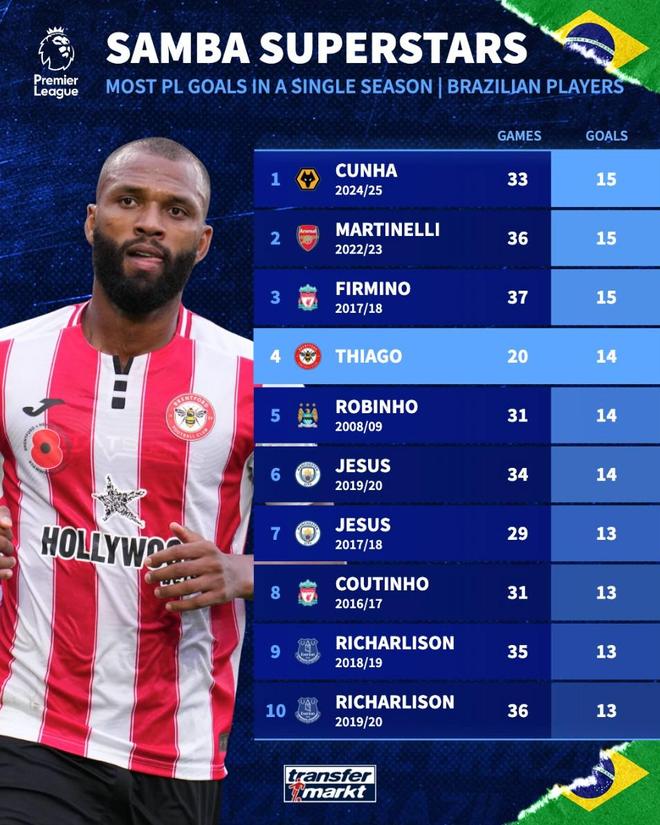 4. 伊戈尔-蒂亚戈 2025-26赛季(布伦特福德) 20场 14球