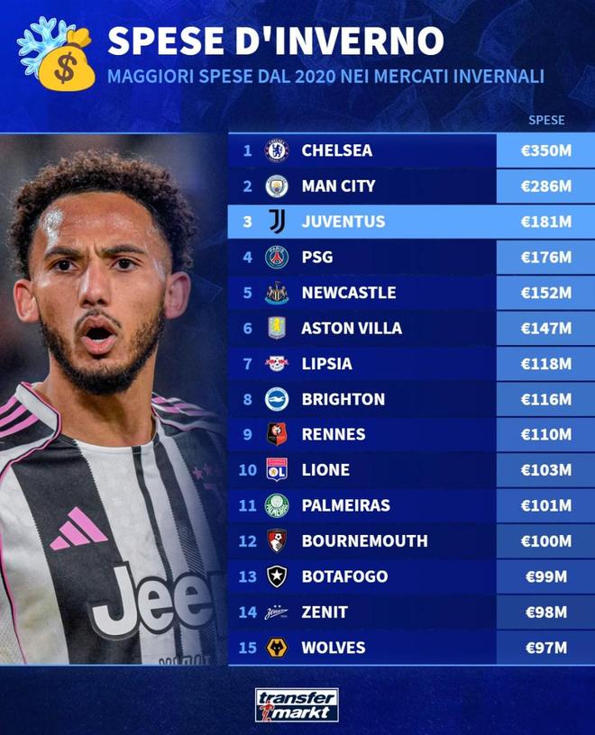 北京时间1月7日,德转列出了过去5年冬窗引援支出排行榜,切尔西3.5亿欧元高居第一,曼城2.86亿欧元第二,尤文图斯1.81亿欧元第三。德转列2020年至2025年冬窗引援支出前15俱乐部:1.