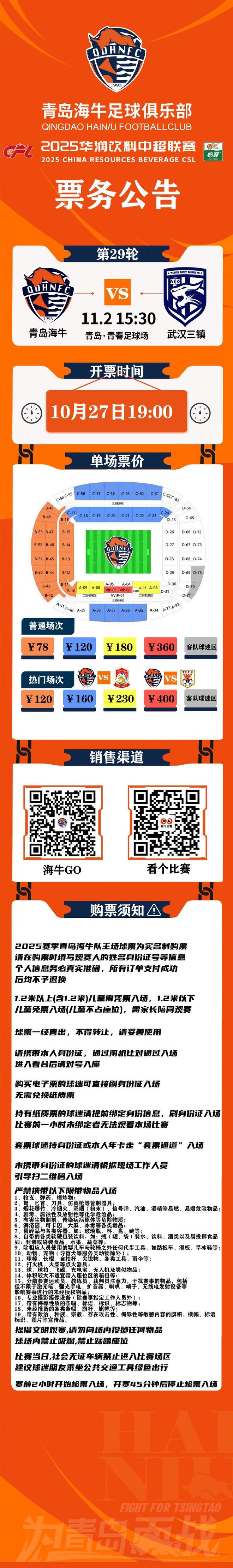 北京时间10月27日,青岛海牛官方发布票务公告,球队主场战武汉三镇的球票今日19:00开售。本场比赛为普通场次,球票分为78元、120、180、360元四个价格。开票时间为今日19:00。若