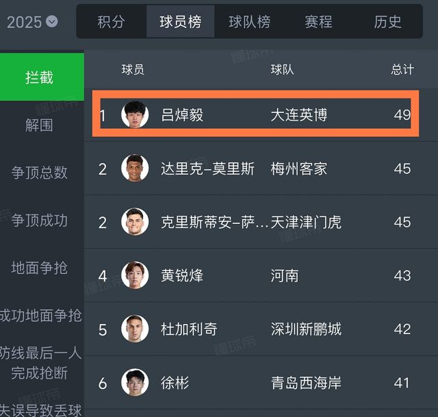 第一个,吕焯毅本赛季确实是整个中超表现最好的边后卫之一了,他不仅贡献2球4助攻,而且中超拦截榜第1名,抢断榜也是高居第2位,从数据上来看,他的能力真配得上国足了。可以看到,他不仅具备助攻和进球能力,防守端也是表现相当出色。